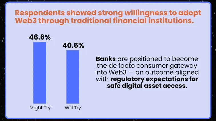 The survey suggests that banks are positioned to become the de facto consumer gateway into Web3 — an outcome aligned with regulatory expectations for safe digital asset access.