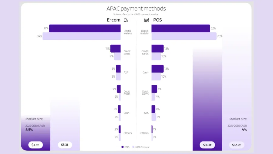 Digital wallets accounted for the majority of payments in Asia-Pacific (APAC) in 2025, making up 77% of e-commerce transaction value and 63% of point-of-sale (POS) spending, according to the Global Payments Report 2026 report by Worldpay.